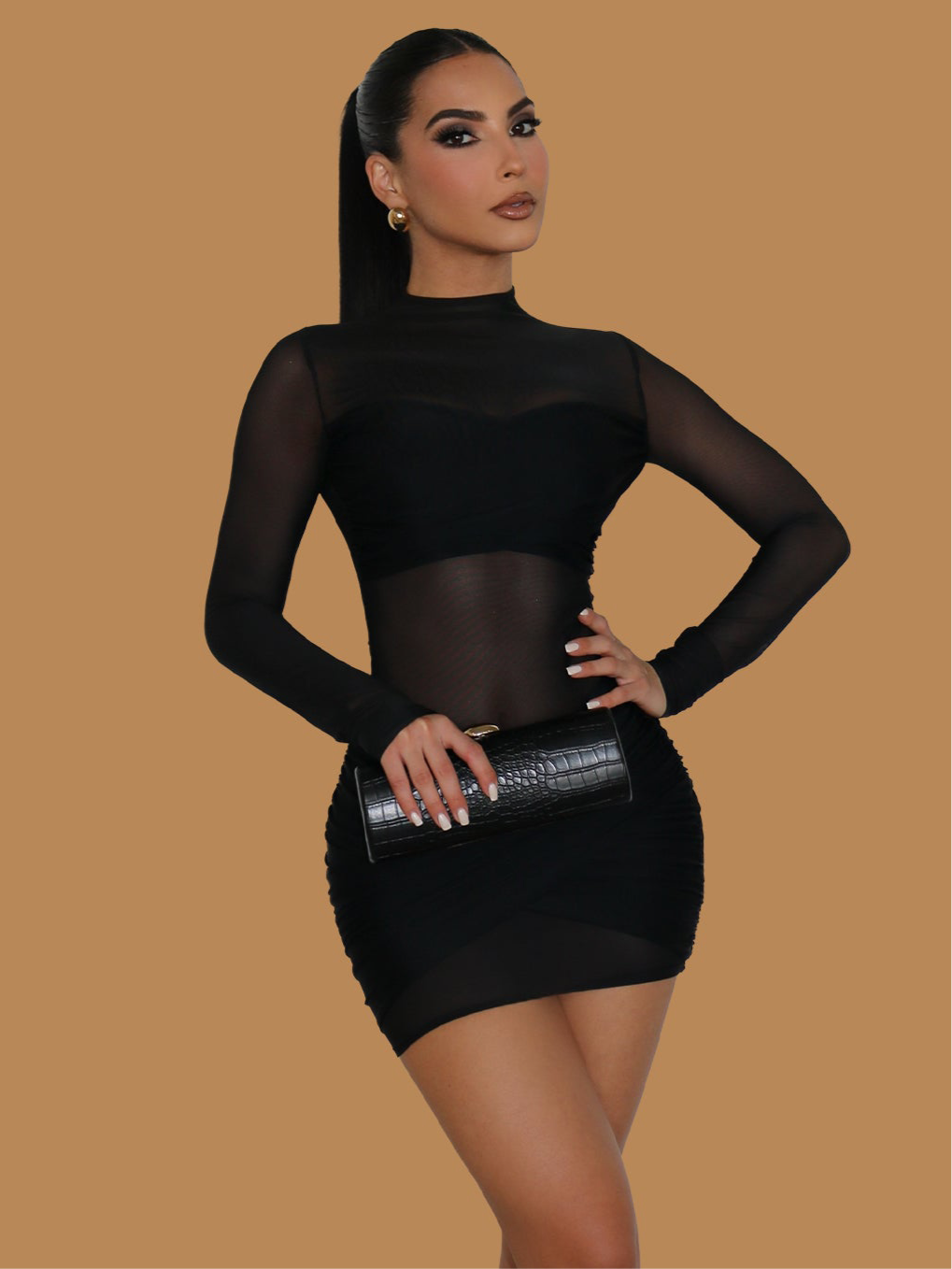 SHEER MESH LONG SLEEVE MINI DRESS