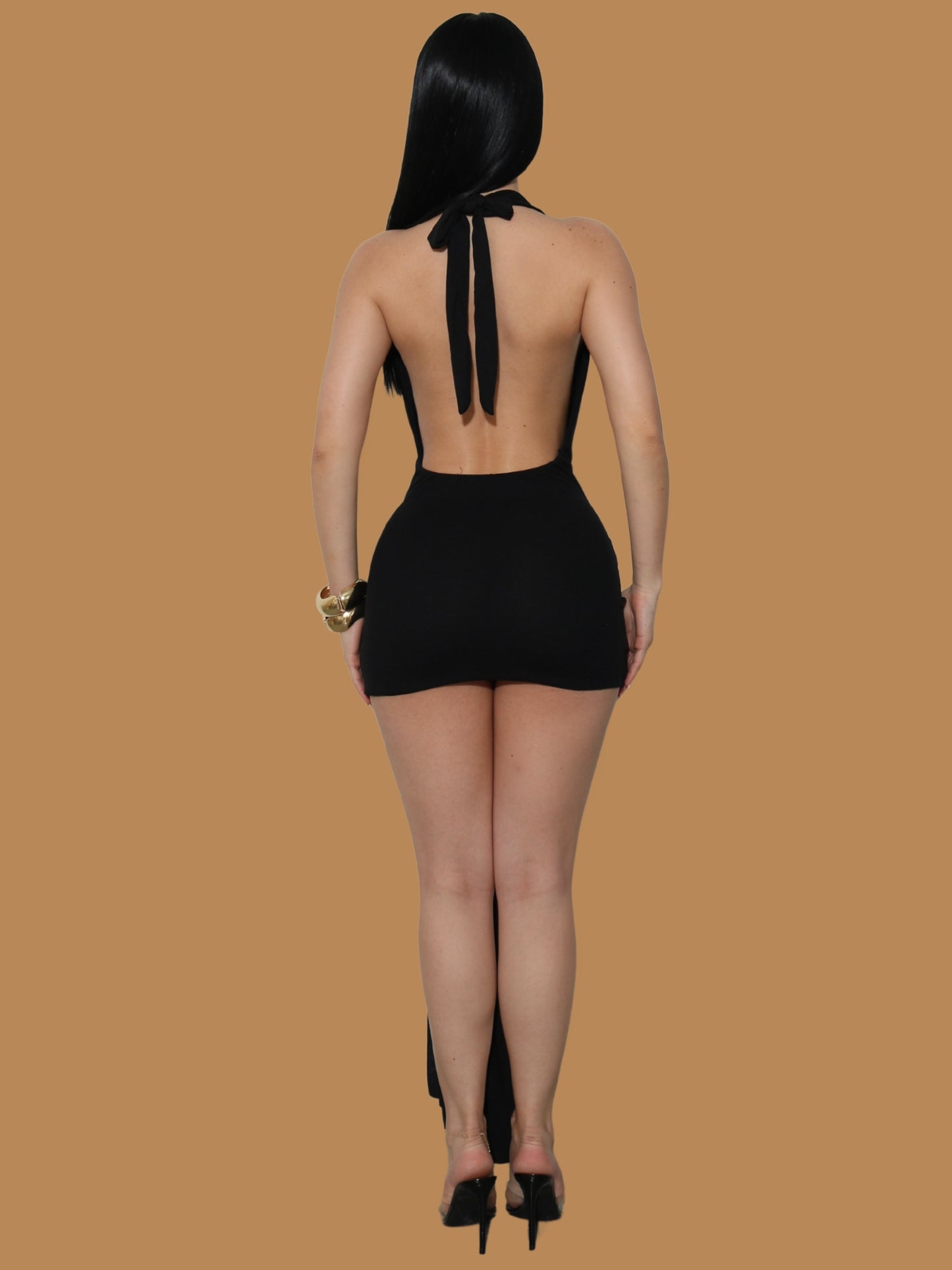 A bold and sultry statement piece designed to command attention. This black mini dress features a dramatic plunging cowl neckline with a halter tie that highlights the shoulders and open back, creating an effortlessly seductive silhouette. The body-hugging fit accentuates your curves, while the draped front detail cascades down for an elevated, eye-catching finish. Perfect for nights out, special occasions, or any moment you want to stand out, this piece blends sleek sophistication with undeniable allure.