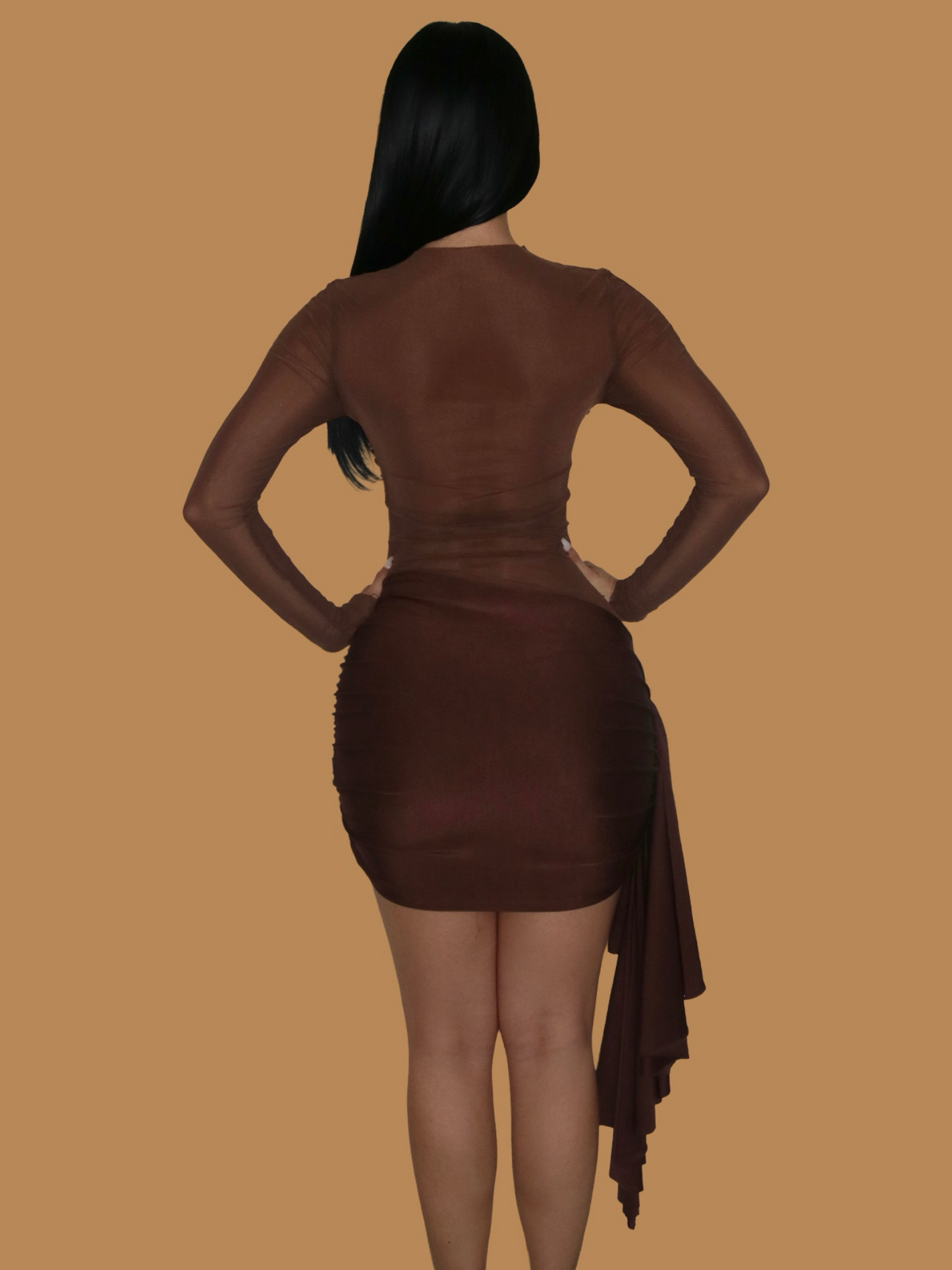 Regular price $45.00Turn heads and own the night in this rich chocolate brown sheer mesh bodycon dress, designed for the bold and confident woman. The high-stretch mesh overlay hugs your curves in all the right places, offering a flattering second-skin fit that’s both sexy and sophisticated. Long sheer sleeves and a sleek crew neckline elevate the look, while the asymmetrical ruched side drape adds eye-catching movement and dramatic flair. A built-in bandeau-style lining provides just the right amount of coverage, allowing you to show off your figure with confidence.