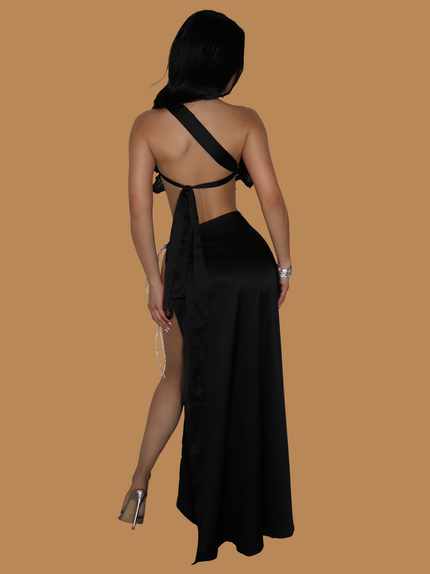 Regular price $50.00Command attention in this bold and versatile statement piece designed for ultimate sophistication. The intricate top features 3D floral appliqués adorned with shimmering embellishments, creating a striking, textured design that sparkles with every movement. The sleek skirt has a high side slit, adding an element of allure and allowing for effortless movement. The adjustable rhinestone tie closure ensures a custom fit while elevating the overall look with a touch of sparkle. Crafted from premium satin fabric, this skirt drapes beautifully, creating a luxurious and polished silhouette.
