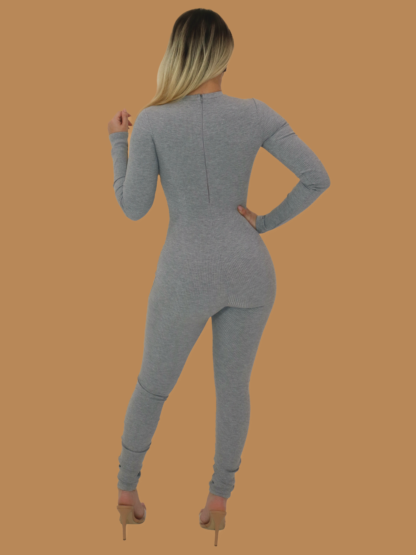 Regular price $48.00Stay stylish and cozy with this sleek grey ribbed long-sleeve jumpsuit. Designed with a body-hugging silhouette, this one-piece outfit flatters your curves while providing unmatched comfort. The ribbed fabric adds texture and stretch, making it a perfect choice for lounging, casual outings, or layering with your favorite outerwear.