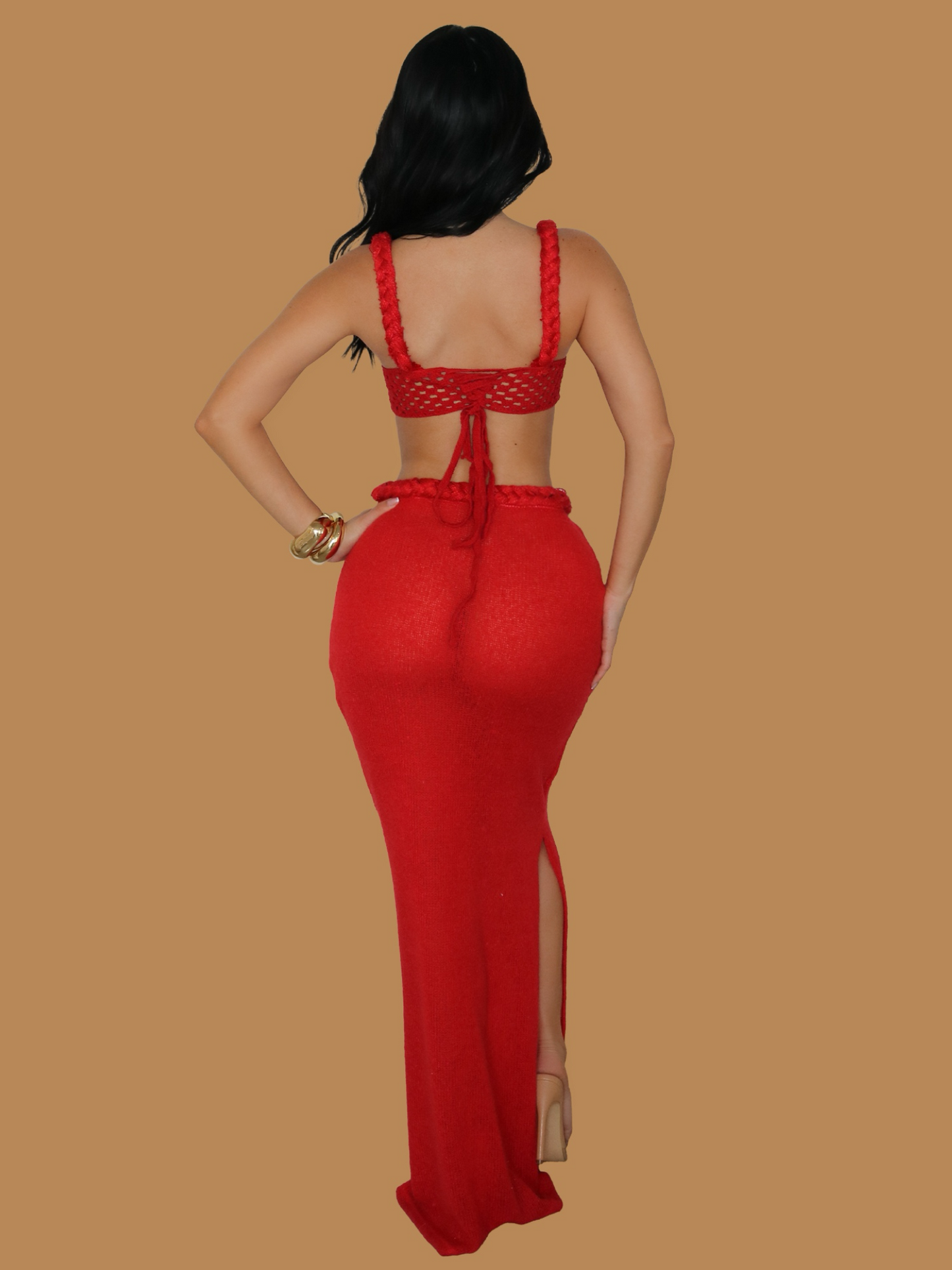 Regular price $60.00Bring fire to your fit with this bold red crochet two-piece set designed to flatter and turn heads. Featuring a structured bustier-style crochet crop top with thick braided straps and a lace-up back, this top serves both support and statement. The matching high-waisted maxi skirt hugs your curves with a stretch-knit fit and finishes with a side slit for that touch of leg. Handcrafted texture meets sultry elegance in a set that’s perfect for everything from vacation nights to upscale summer parties.