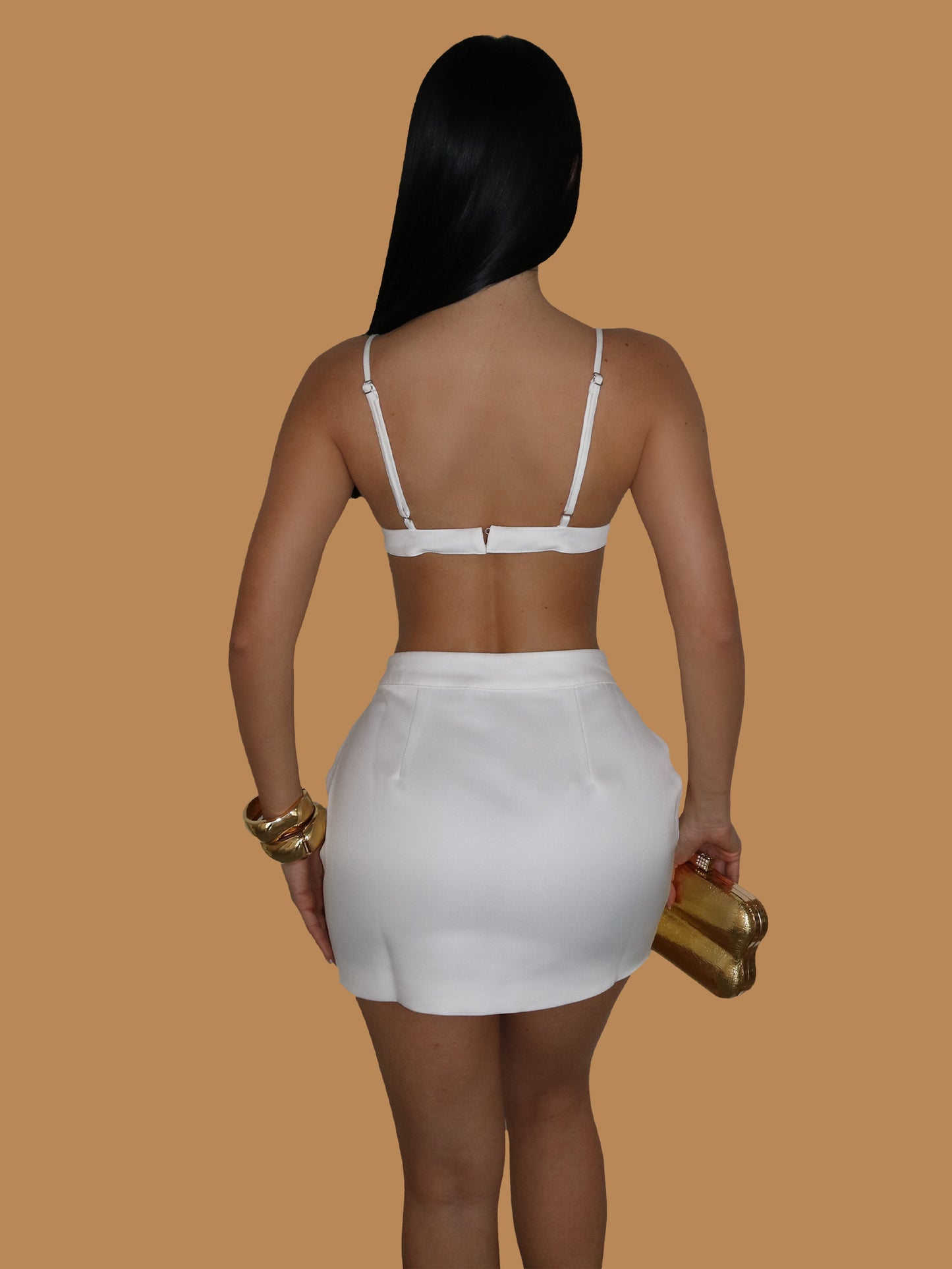Regular price $68.00Make an unforgettable entrance with this white three-piece blazer skirt set, designed for the bold and fashion-forward. Featuring a tailored oversized blazer, a sleek high-waisted mini skirt, and a chic bralette top, this set offers endless styling possibilities. The crisp white fabric exudes sophistication, while the structured fit ensures a polished look for any occasion – from rooftop soirées to elegant brunches.